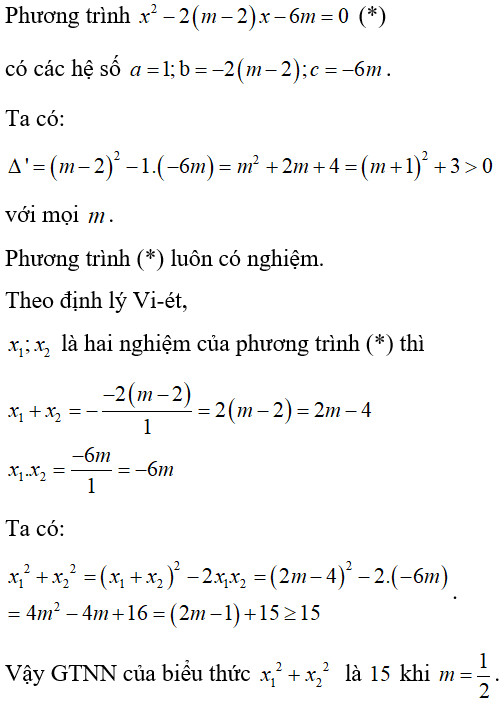 Ví dụ 1: Tìm $m$ để phương trình $x^2 – 2(m – 2)x – 6m = 0$ có nghiệm $x_1; x_2$ sao cho biểu thức $x_1^2 + x_2^2$ đạt giá trị nhỏ nhất.